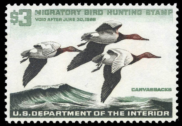 Federal Duck Stamp, 1965, $3 Canvasback Drakes (Scott RW32), superbe. SMQ $225.