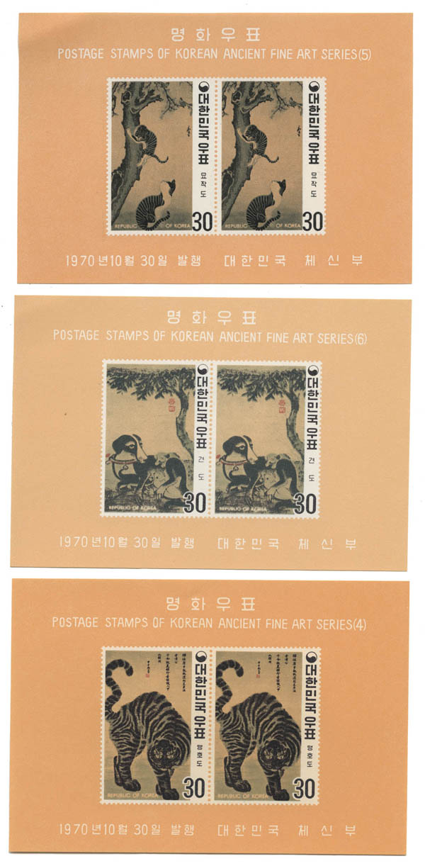 Korea (South), 1970, Ancient Fine Art Series souvenir sheets complete, perf and imperf (Scott 718a-720a), très beau. Scott $279.