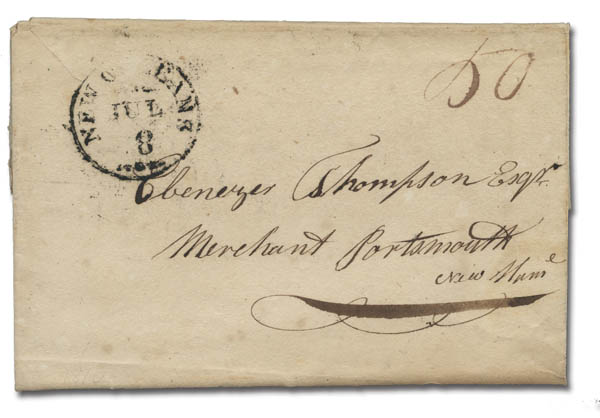 Lot 123![]() [Louisiana Territory] New Orleans, July 8, 1810 c.d.s. on a stampless folded letter to Portsmouth, N.H., with "50"¢ double rate paid; business letter about lack of shipping at the moment, Fine to Very Fine, a very scarce early territorial usage. Estimate $250 - 350. |