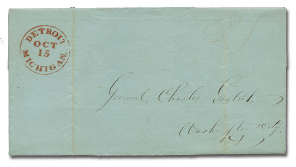 Lot 127![]() [Michigan Territory] Detroit, bold strike of Oct 15 c.d.s. on an 1833 folded letter to General Charles Gratios in Washington, D.C., from a soldier who had served under him in the War of 1812, Fine to Very Fine, an attractive and interesting territorial usage. Estimate $100 - 150. |