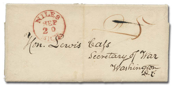 Lot 128![]() [Michigan Territory] Niles, clear strike of red c.d.s. on an 1834 folded letter to the Secretary of War in Washington, D.C.; rating 25 struck out because of the franking privilege. Estimate $100 - 150 This example predates the ACSC listing of 1835 . |