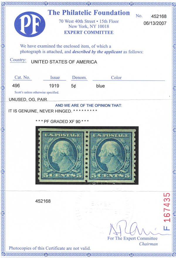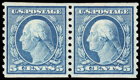 1919, 5¢ Washington, blue, unwatermarked, rotary press coil, perf. 10 vertically (Scott 496), XF 90. Scott $18. SMQ $55.