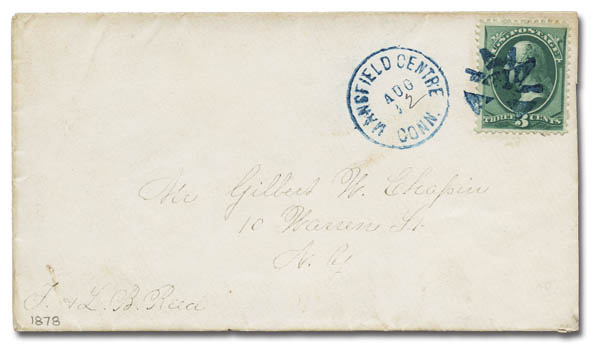Geometric (Mansfield Centre, Conn.), clear sharp strike in blue ties well centered 3¢ green on an attractive 1878 cover to New York, Very Fine, Ex-Skinner. Scott 158.