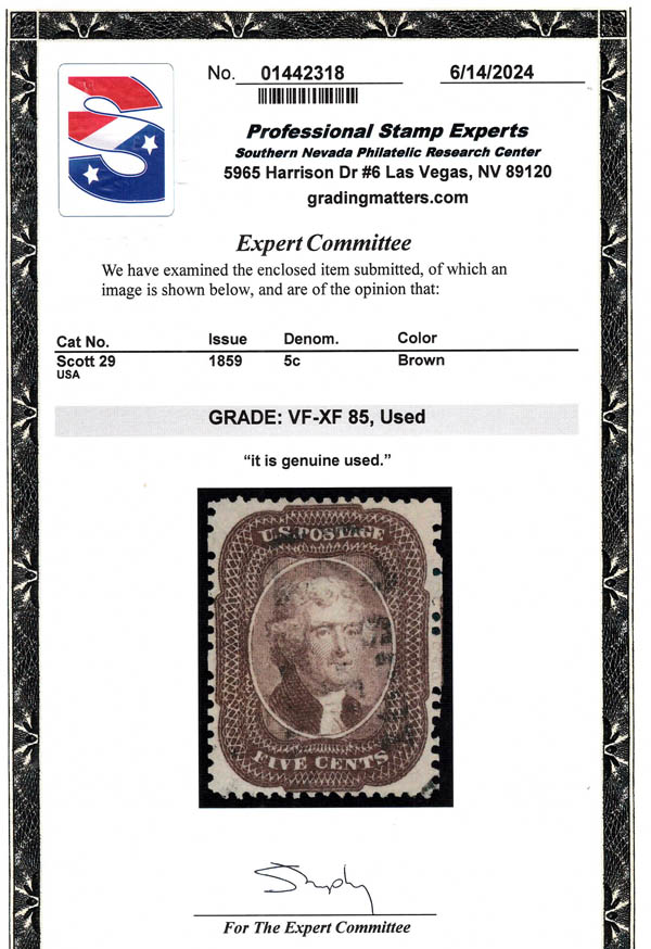 1859, 5¢ Jefferson, brown, type I (Scott 29), VF-XF 85. Scott $325. SMQ $625.