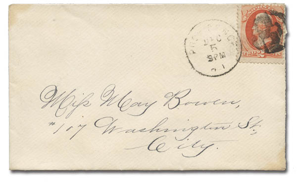 Jack-O-Lantern (Providence, R.I.), bold strike ties 2¢ Bank Note on a local cover, Very Fine, a rare cancel. Scott 183. Cole JO-50.