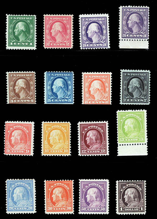 1917, Washington-Franklins, perf. 11, group of 16 (Scott 498//518), beau à très beau. Scott $441.