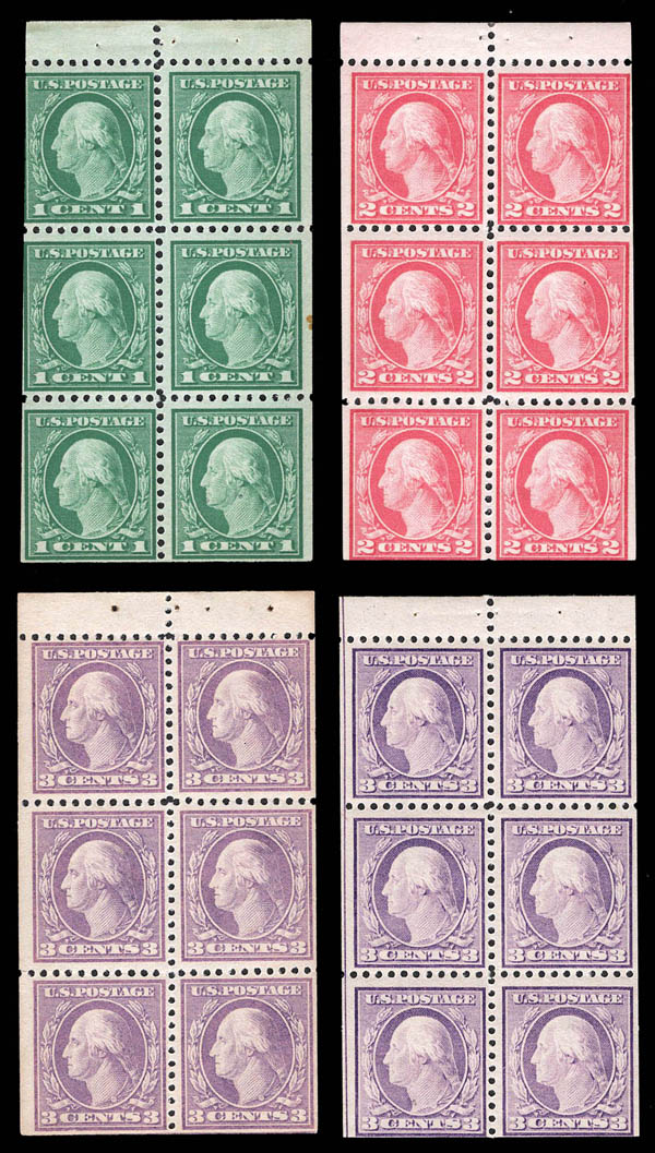 1917, 1¢ Washington, green, perf. 11, booklet pane of 6 (Scott 498e, 499e, 501b, 502b), beau à très beau. Scott $165.