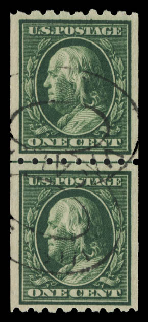Lot 217 o 1910, 1¢ green, vertical coil (Scott 390), line pair, outstandingly well centered, very scarce this nice, neat light cancel, Extremely Fine to Superb, with 2010 P.F. certificate. Scott $125. Estimate $150 - 200. |
