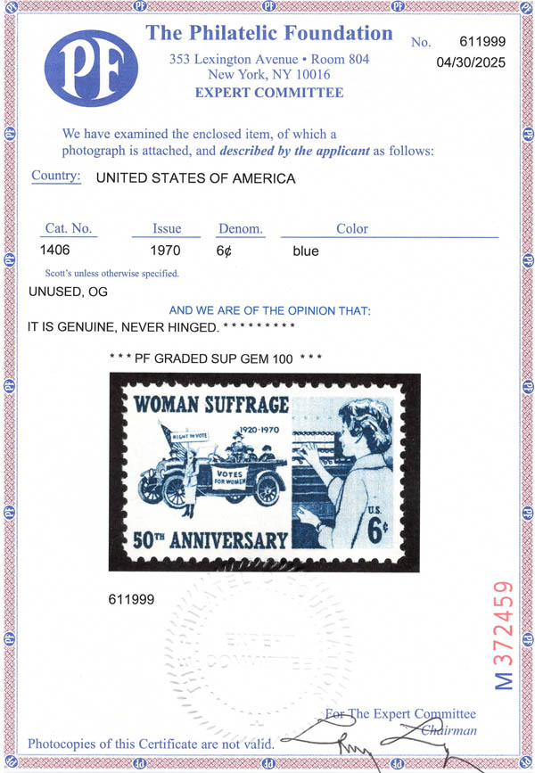 1970, 6¢ Women's Suffrage (Scott 1406), GEM 100. SMQ $35 for a 95.