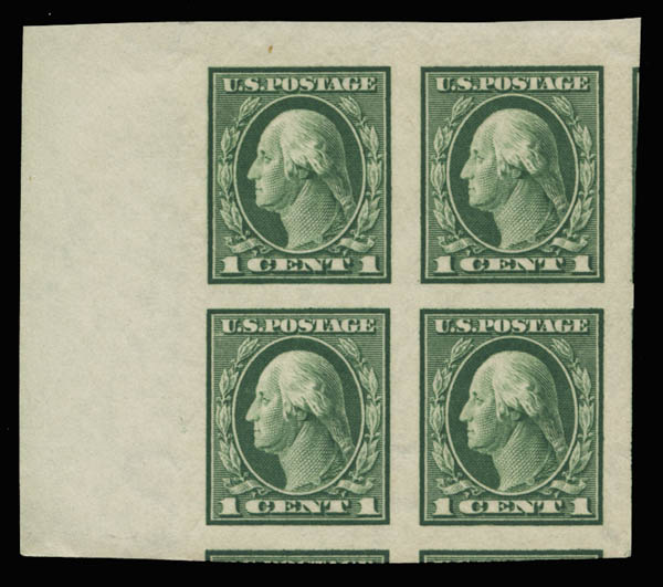 1912, 1¢ green, imperf (Scott 408), corner margin block of 4, spectacular margins, o.g., never hinged, Superb.