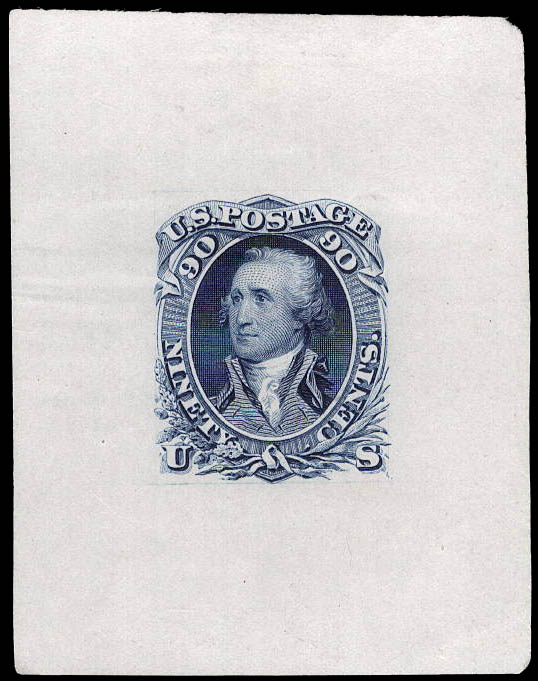 1861, 90¢ Washington, N.B.N.C. "Premiere Gravure" essay, in blue (Scott 72-E7e), plate proof on India paper (formerly No. 62P3), très beau. Scott $500.