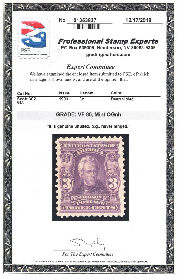1903, 3¢ Jackson, bright violet (Scott 302), VF 80. Scott $140. SMQ $130.