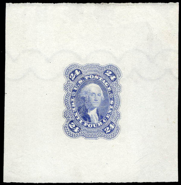 1861, 24¢ Washington essay, by Toppan, Carpenter & Co., in light blue (Scott 70-E4k), complete design, die on bond paper, scallops watermark (1903), très beau. Scott $300.