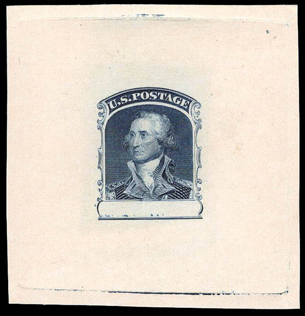 Lot 242 E 1861, 90¢ Washington essay, by Toppan, Carpenter & Co., in dark blue (Scott 72-E3b), vignette plus top label, die proof on buff colored card (1903), très beau à superbe. Scott $185. Estimate $60 - 80. |