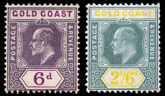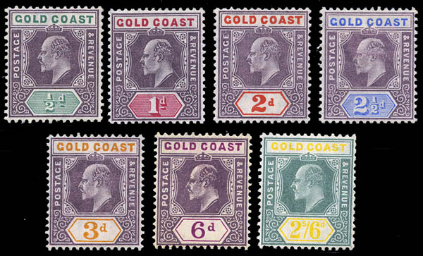 Gold Coast, 1904-06, King Edward VII, ½d to 2s6d complete, Multiple Crown CA watermark (SG 49/57. Scott 49-55), set of 7, beau à très beau. SG £225 ($290). Scott $297.