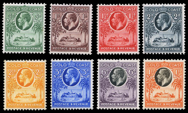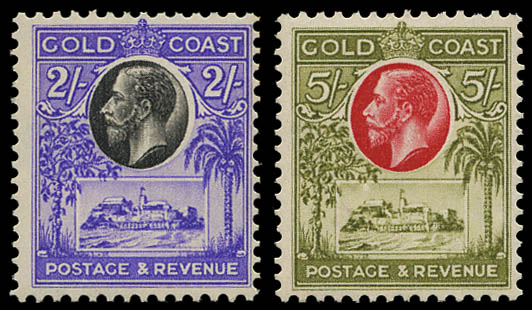 Lot 254![]() ![]() Gold Coast, 1928, King George V, ½d to 5s complete (SG 103/112. Scott 98-107), set of 10, beau à très beau. Catalog values are for hinged, never hinged carries a premium. SG £120 ($150). Scott $143. Estimate $60 - 80. |