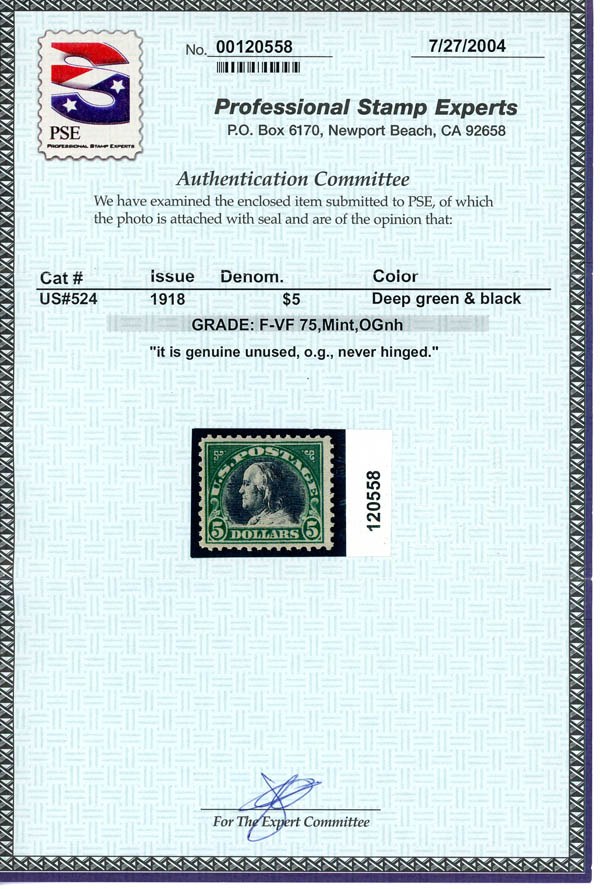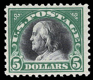 1918, $5 Franklin, deep green & black (Scott 524), beau à très beau. Scott $340.