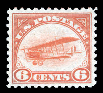Lot 288![]() ![]() Airmail, 1918, 6¢ orange (Scott C1), superlative centering, ample margins and great color make this a gem! o.g., never hinged, Extremely Fine, with 2006 P.S.E. certificate graded XF 90. Scott $110. SMQ $225. Estimate $150 - 200. |