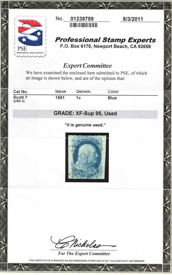 1851, 1¢ Franklin, blue, type II (Scott 7), XF-SUP 95. Scott $140. SMQ $750.
