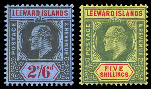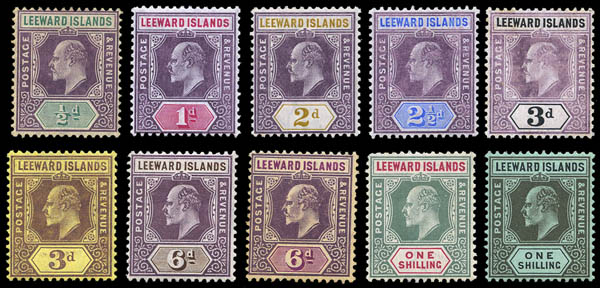 Leeward Islands, 1905-11, King Edward VII, ½d to 5s, chalky paper (SG 29//45. Scott 29-40), set of 12, complete by Scott, beau à très beau. Scott $367.