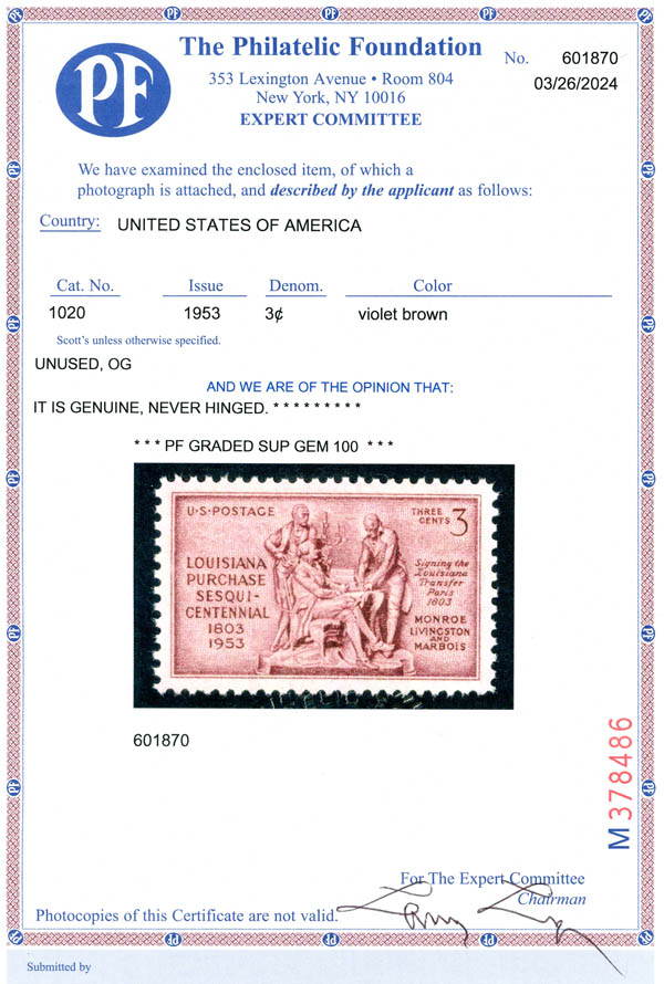 1953, 3¢ Louisiana Purchase (Scott 1020), GEM 100. SMQ $150.