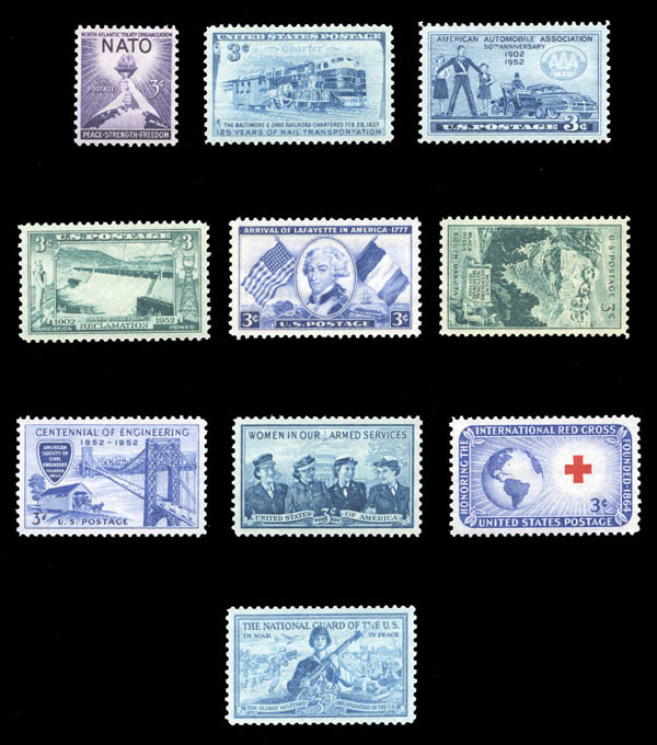 1952, 3¢ B. & O. Railroad, and 9 other high quality commemoratives (Scott 1006), superbe.