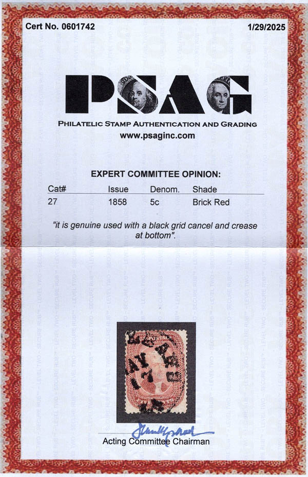 1858, 5¢ Jefferson, brick red, type I (Scott 27), presque beau. Scott $1,450.