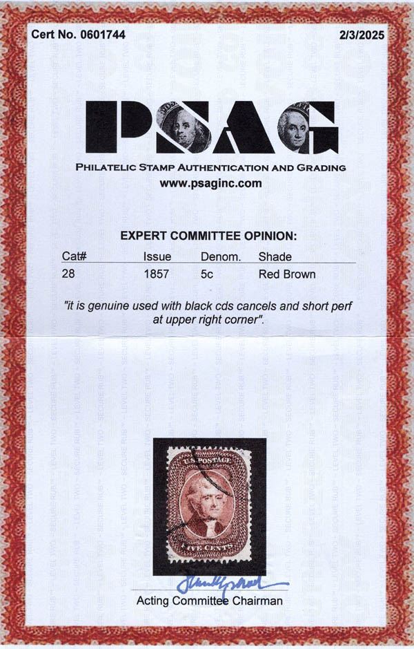 1857, 5¢ Jefferson, red brown, type I (Scott 28), sinon beau à très beau. Scott $1,100.