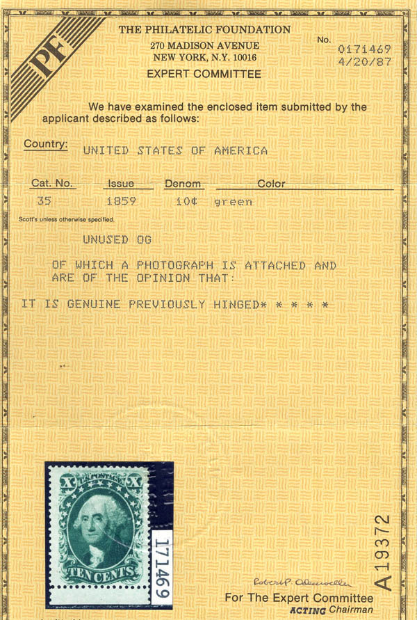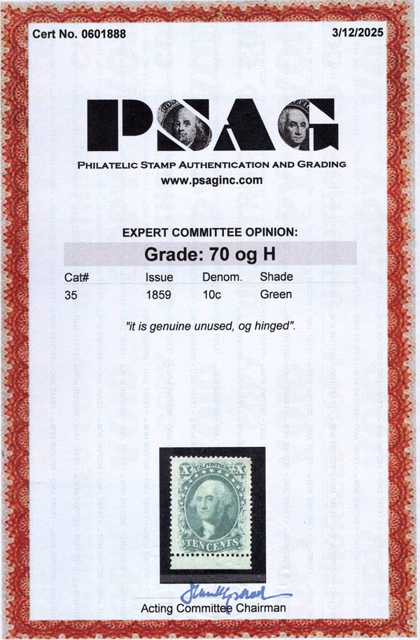 1859, 10¢ Washington, green, type V (Scott 35), beau. Scott $210. SMQ $115. Scott Stamp Values $75.