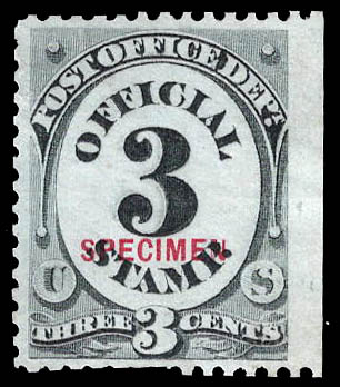 Post Office Dept., 1875 Special Printing, 3¢ black, overprinted "Specimen" (Scott O49SD), f.-v.f. for the issue. Scott $1,600.
