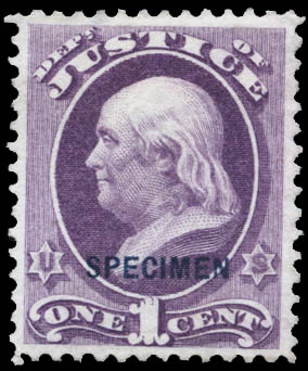 Justice Dept., 1875 Special Printing, 1¢ purple, overprinted "Specimen" (Scott O25SD), superbe. Scott $33.
