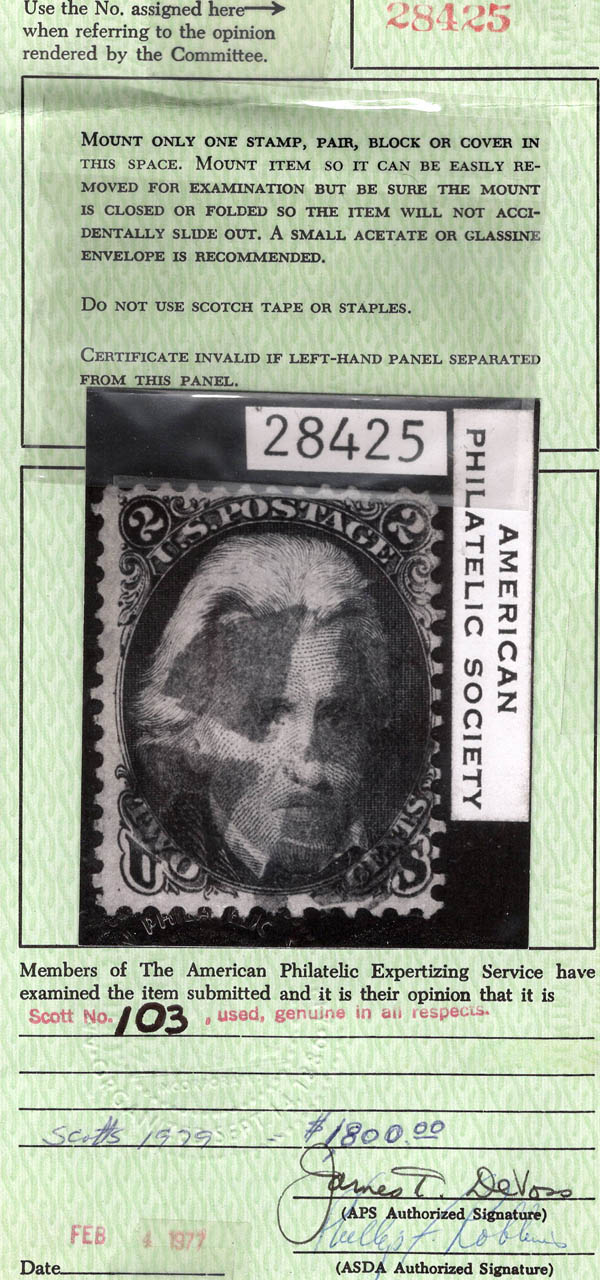 1861-66 (1875 Re-issue), 2¢ Jackson, black (Scott 103), beau ou presque beau. Scott $10,500.
