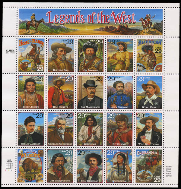 1994, Legends of the West, recalled, miniature sheet of 20 (Scott 2870), superbe. Scott $125.