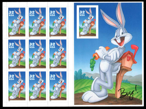 1997, 32¢ Bugs Bunny, self-adhesive, pane of 10 (Scott 3138), die cutting extends through the backing paper, superbe. Scott $130.