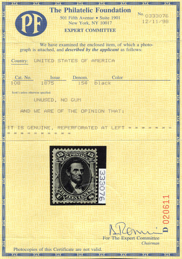 1861-66 (1875 Re-issue), 15¢ Lincoln, black (Scott 108), bel aspect. Scott $2,100.