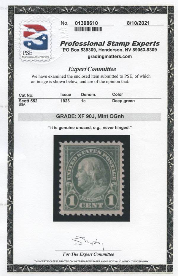 1923, 1¢ Franklin (Scott 552), superbe. SMQ $30.