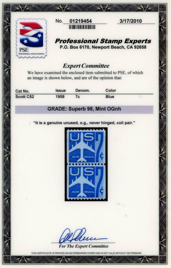 Airmail, 1958, 7¢ blue Jet coil (Scott C52), SUP 98. SMQ $135.