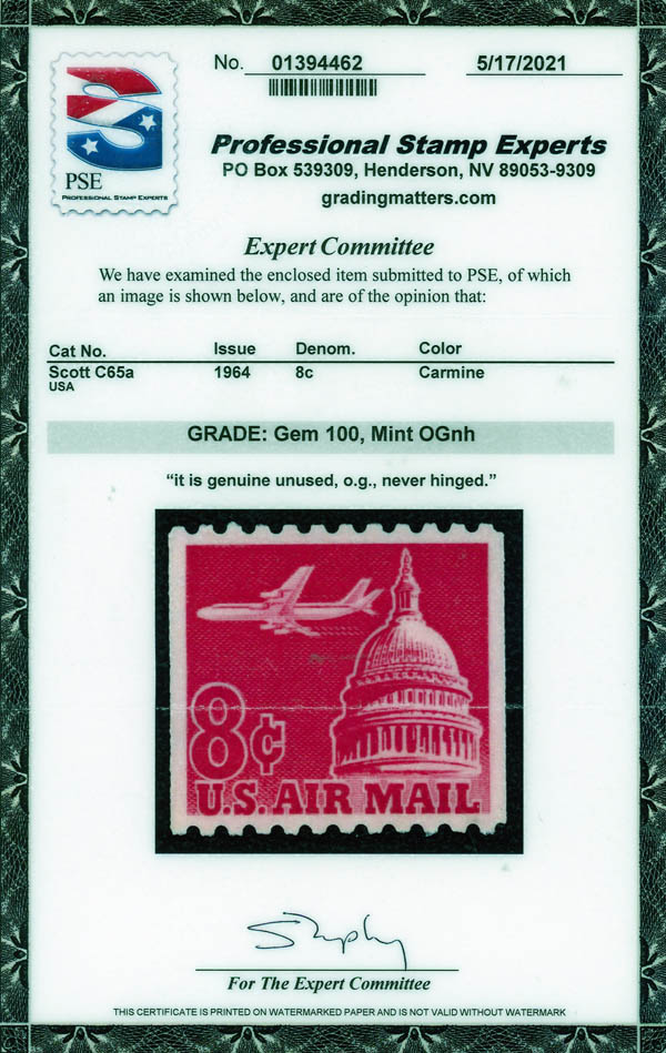 Airmail, 1962, 8¢ Jet & Capitol coil, tagged (Scott C65a), GEM 100. SMQ $160.