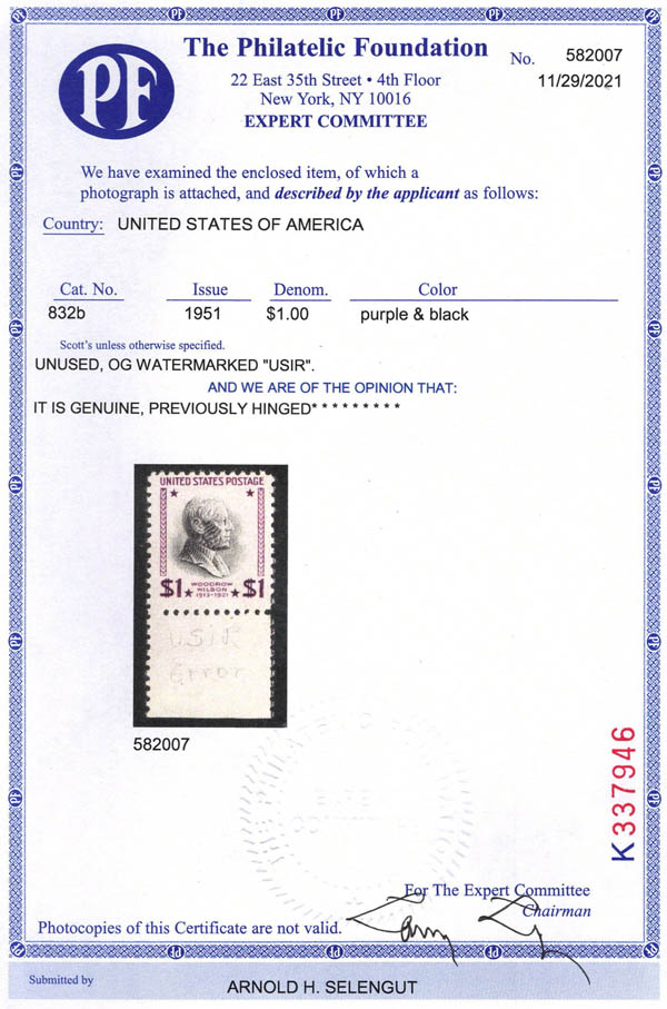 1951, $1 Wilson, watermarked USIR (Scott 832b), beau à très beau. Scott $120.