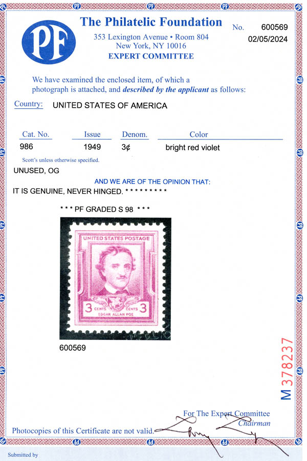 1949, 3¢ Edgar Allan Poe (Scott 986), SUP 98. SMQ $60.