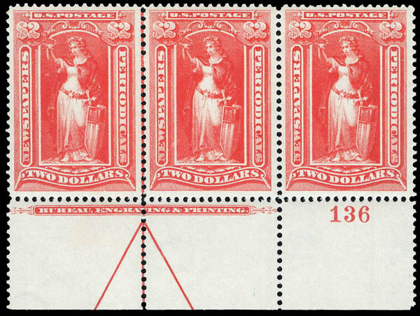 Newspaper, 1897, $2 scarlet, Bureau printing, D.L. watermark (Scott PR120), superbe. Scott $225 as singles.