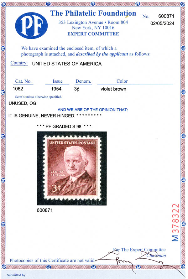 1954, 3¢ George Eastman (Scott 1062), SUP 98. SMQ $55.