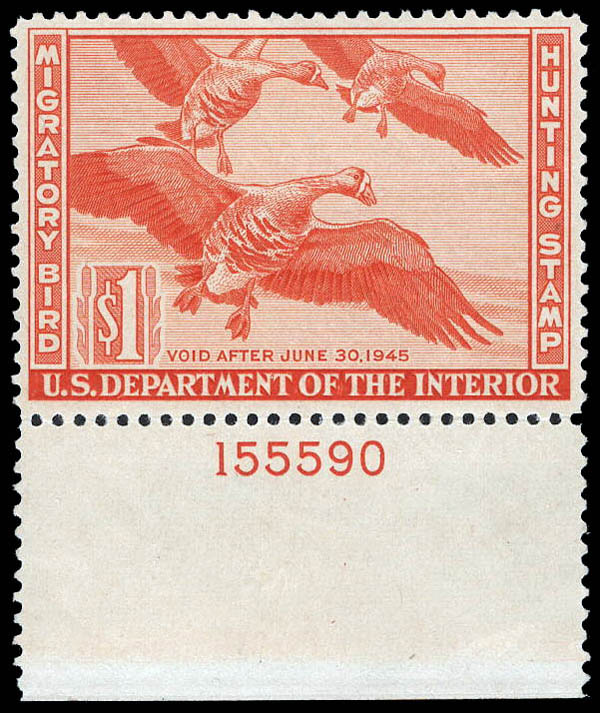 Federal Duck Stamp, 1944, $1 White-fronted Geese (Scott RW11), VF 80. Scott $125. SMQ $135.