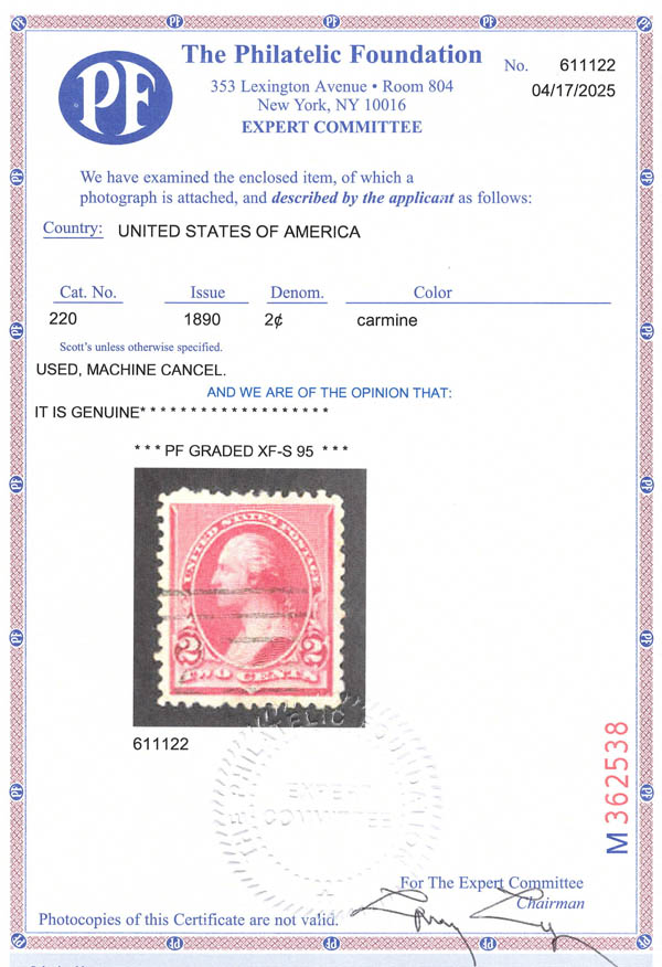 1890, 2¢ Washington, carmine (Scott 220), XF-SUP 95. SMQ $110. Scott Stamp Values $105.