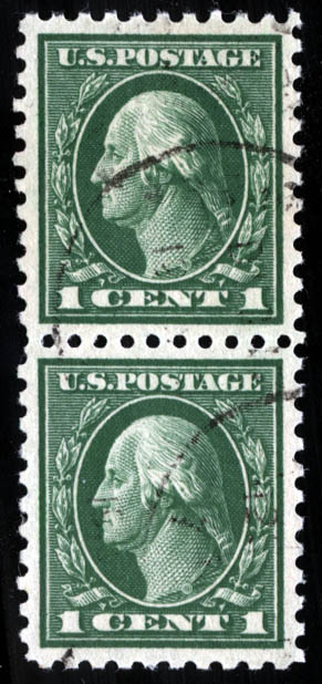 1914, 1¢ green (Scott 424), vertical pair, as close to perfect as this issue comes, very light cancels, Superb, with 2014 P.S.E. certificate.