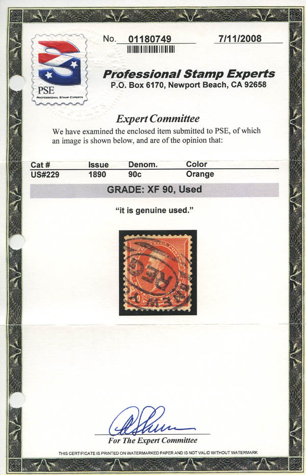 1890, 90¢ Perry, orange (Scott 229), XF 90. Scott $140. SMQ $270.