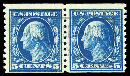 1914, 5¢ blue, horizontal flat plate coil (Scott 447), pair, boxed handstamp cancel, Fine to Very Fine, with 2019 P.S.E. certificate.