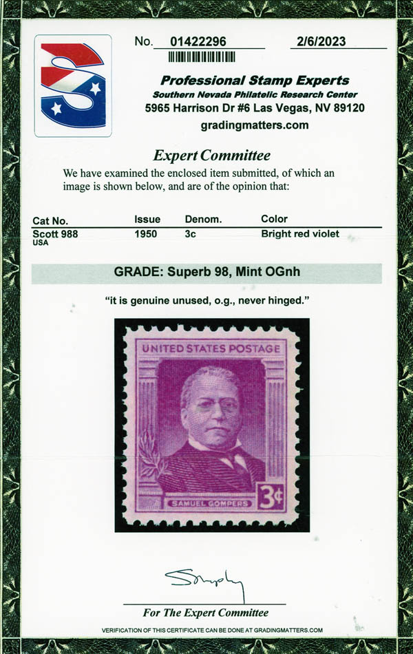 1950, 3¢ Samuel Gompers (Scott 988), SUP 98. SMQ $60.
