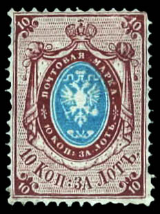 Russia, 1865, Coat of Arms, 10k brown & blue (Scott 15), presque très beau. Scott $925. Michel 15y.