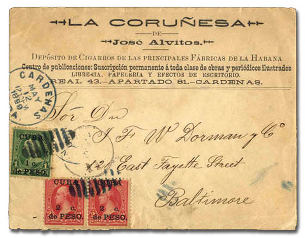 Cuba, 1899, Cigar advertising cover to Baltimore, beau à très beau. Scott 221, 222.